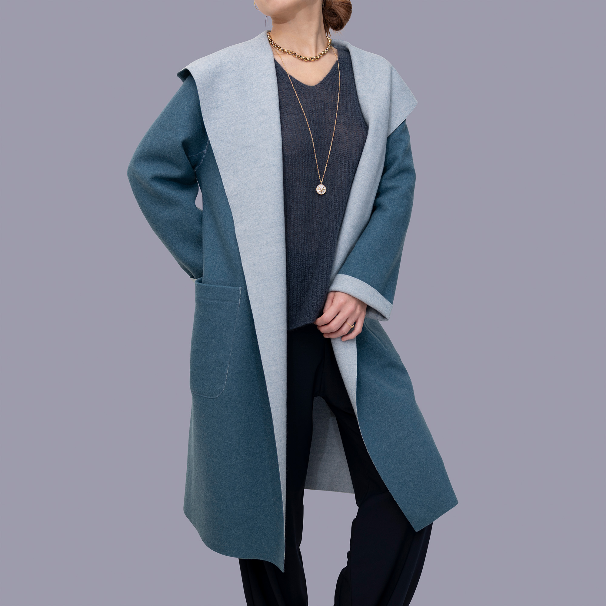 100% wool KARL KARL™ YARN is applicable for knit, jersey/circle knitted fabrics (including the double faced fabric shown in the above coat) and woven fabrics.