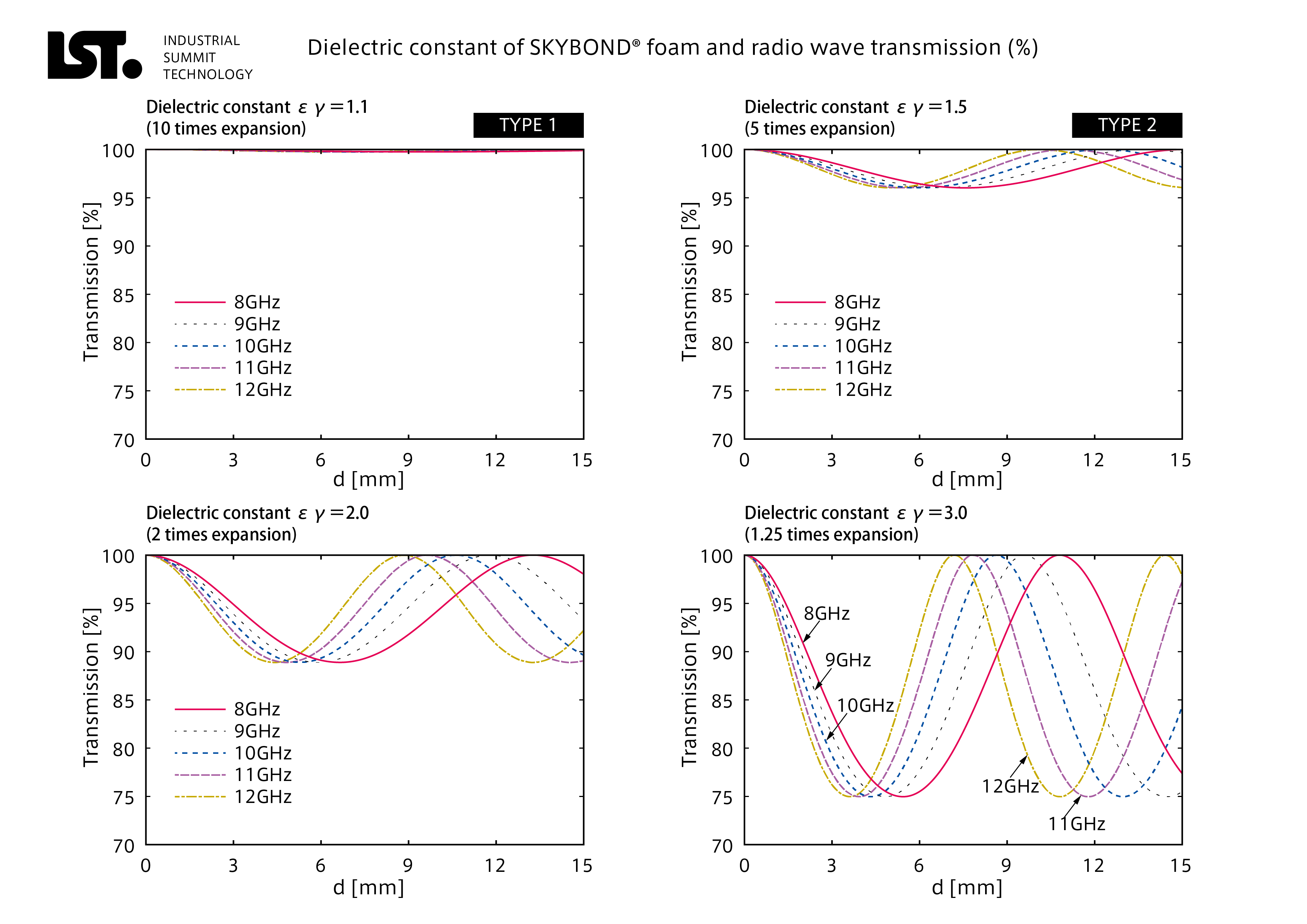 Due to the unique characteristics of polyimide, SKYBOND FOAM exhibits an extremely low dielectric constant and low dielectric loss tangent, which indicate the degrees of radio wave energy loss as index specific to materials. This product can be appropriately installed in places subject to transmitted radio waves, due to its properties of high radio wave transmission, and lesser energy loss. Below is the graph of the dielectric constant of SKYBOND FOAM, and radio wave transmission property data to thickness.
