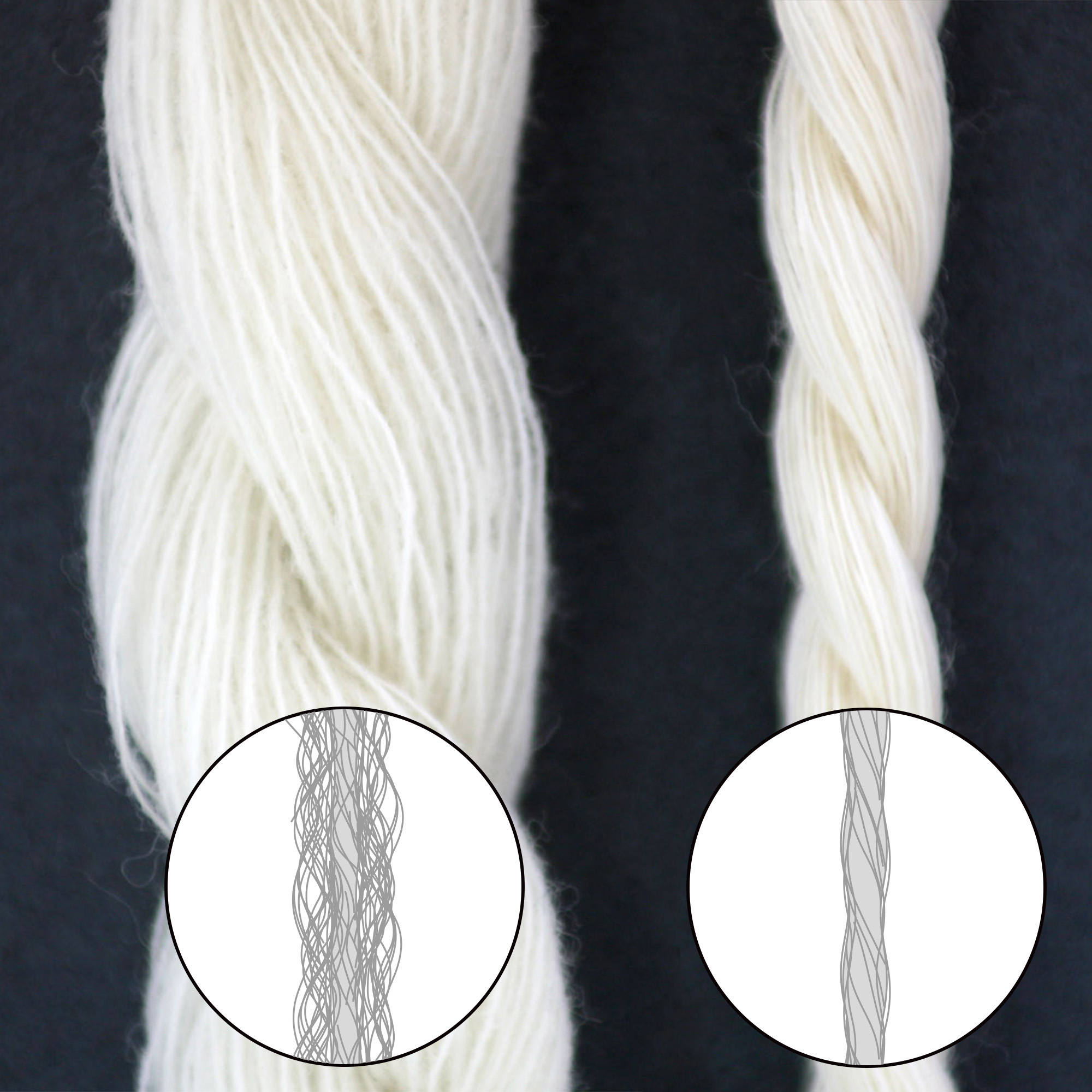 Karl Karlは、糸の中に多くの空気層を含む構造を持ち、優れた保温性と軽さを兼ね備えたかさ高糸になります。