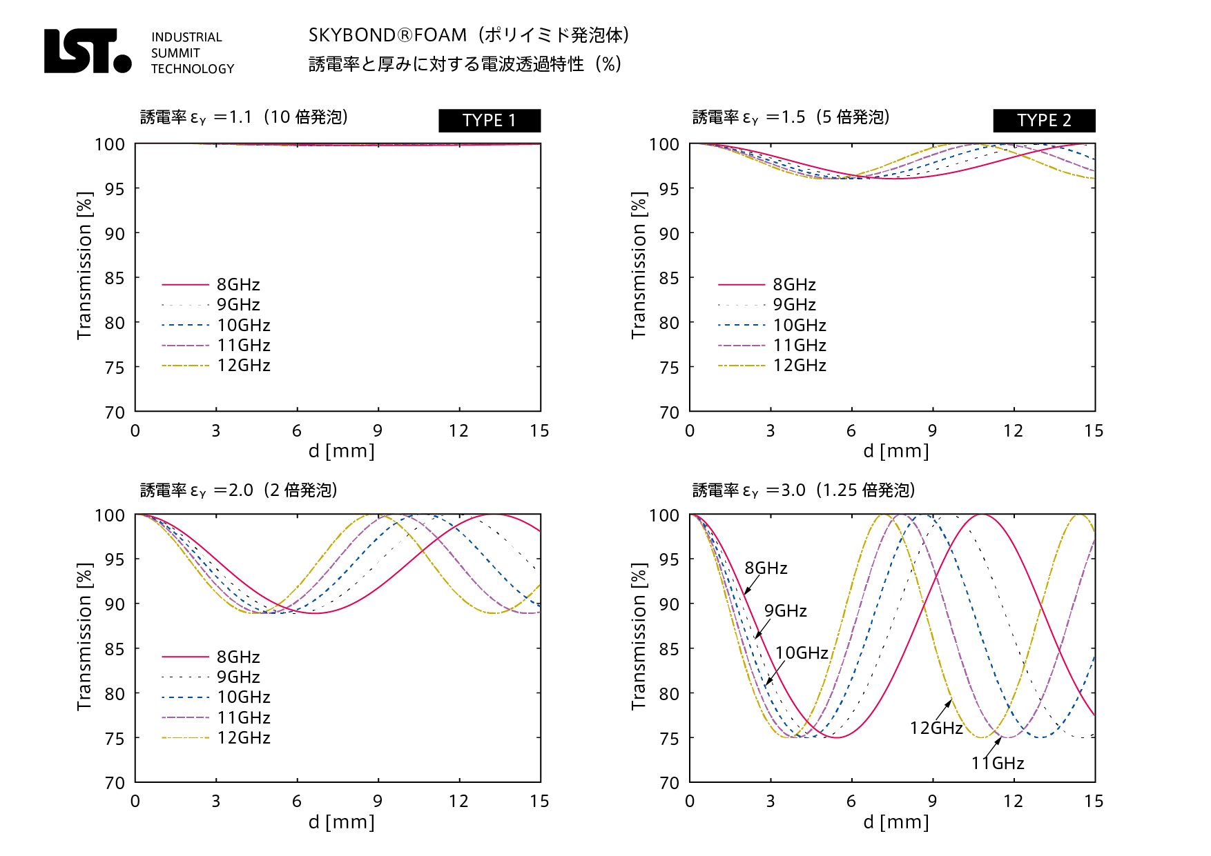 電波のエネルギー損失の度合いを示す材料固有の指標である誘電率や誘電正接についてもポリイミドならではの極めて低い値を示します。電波透過性が高くエネルギーロスが少ないため電波が透過する箇所に設置するのに適しています。以下にSKYBOND FOAMの誘電率と厚みに対する電波透過特性データを示します。