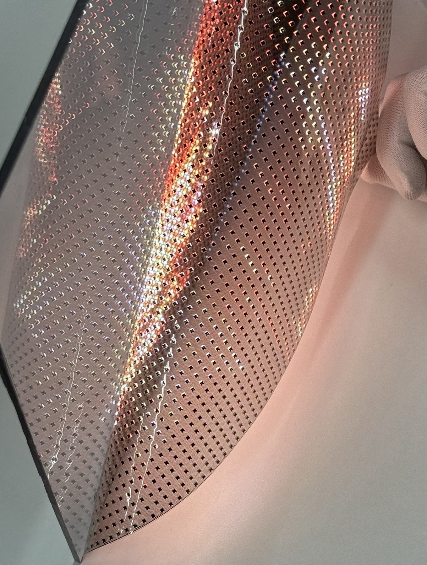 リフレクターは、LEDの光を拡散させてディスプレイの輝度や省エネ性能を向上させるために用いられています。下の写真はTORMEDに銀蒸着を施しており、マイクロLEDディスプレイなどに使用されています。